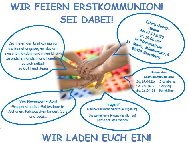 Herzlich laden wir alle Eltern der Kinder der dritten Jahrgangsstufe zu einem Infoabend am 22. Oktober um 19 Uhr in das Pfarrzentrum St. Maria (Mühlbergstr. 6, Starnberg). Wir informieren über die Inhalte der Vorbereitung sowie die Termine.