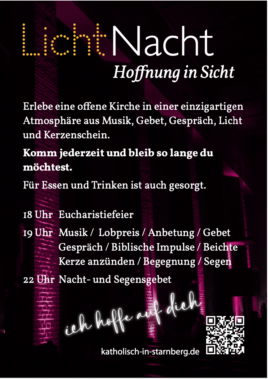 - 19:00 Uhr Musik / Lobpreis / Anbetung / Gebet / Gespräch / Biblische Impulse / Beichte / Kerze anzünden / Begegnung / Segen