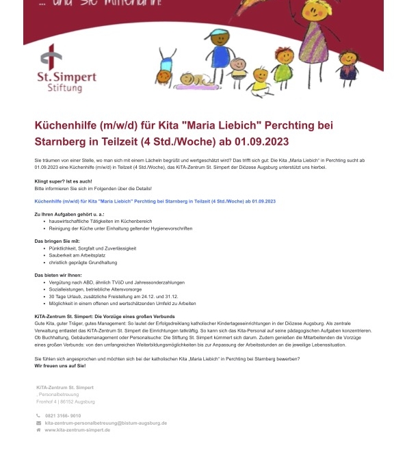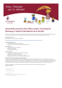 Für unser Kinderhaus „Maria Liebich“ in Perchting suchen wir ab 01.09.2023 eine Küchenhilfe in Teilzeit (4h/Woche).