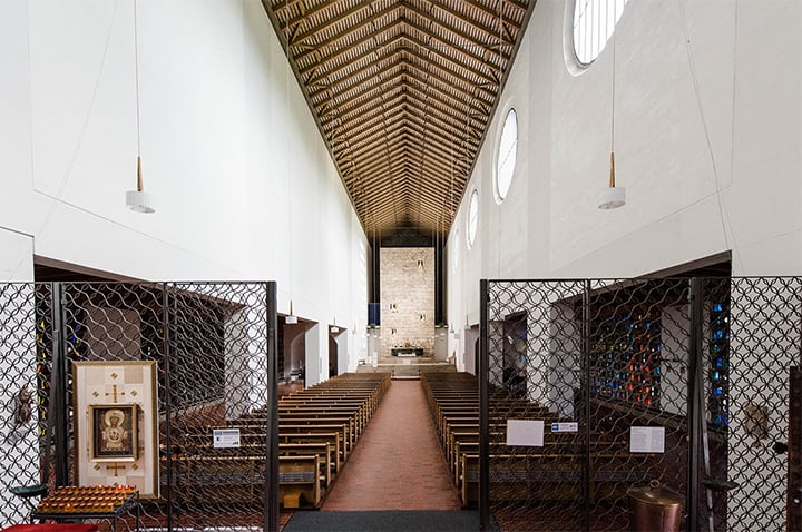 Ihr 56m hoher Turm wird als Besonderheit von einem Petruskreuz bekrönt (Der Apostel Petrus wurde mit dem Kopf nach unten gekreuzigt, weil er aus Ehrfurcht nicht genauso wie Jesus sterben wollte.).